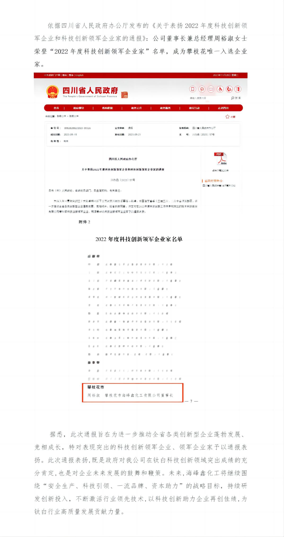【喜報】公司董事長周裕淑女士榮獲四川省2022年度科技創(chuàng)新領軍企業(yè)家稱號